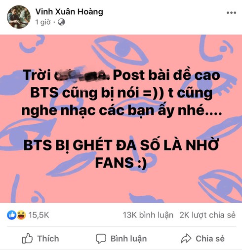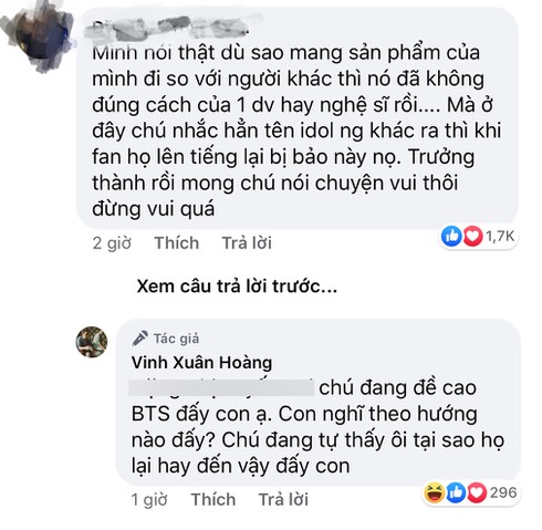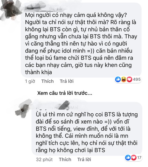 Ngay lập tức dòng chia sẻ này đã gặp phải rất nhiều ý kiến trái chiều. Nhiều fan BTS cho rằng Vinh Râu đang cố ý nhắc tên BTS để so sánh kèm gây sự chú ý. Việc một người nổi tiếng như Vinh Râu so sánh với một nhóm nhạc tầm cỡ châu lục như BTS là điều không nên.