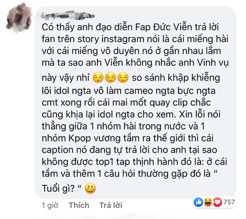 Trong khi đó một số khác lại cho rằng đây chỉ là sự so sánh bình thường để anh chàng động viên bản thân cùng nhóm hài FAP TV phải cố gắng đạt được thành công như BTS. Vinh Râu cũng khẳng định rằng anh nhắc đến BTS với tâm thế đề cao thành tích của nhóm chứ không hề có ý gì tiêu cực hay "cà khịa".