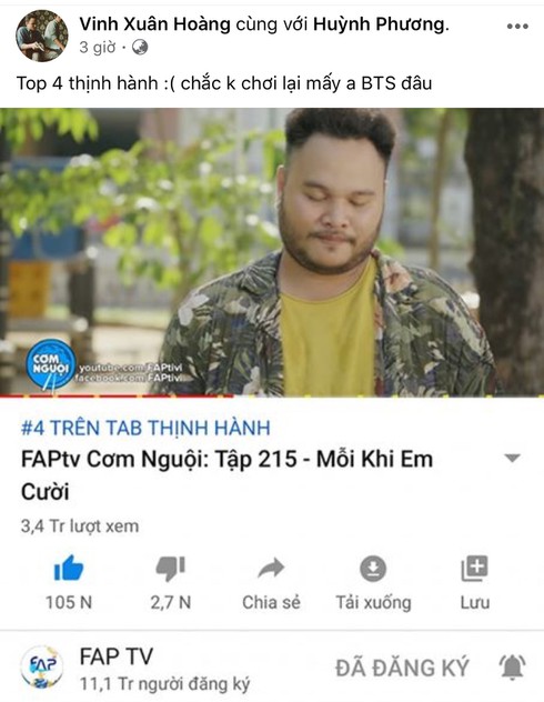 Cụ thể, 2 ngày sau khi sản phẩm "Cơm nguội (tập 215): Mỗi khi em cười" của nhóm hài FAP TV được phát hành trên Youtube, video này đã leo lên #4 trending với số lượt xem hơn 3,5 triệu.
