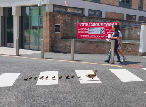 Đàn vịt con theo mẹ qua đường rất đúng vị trí |