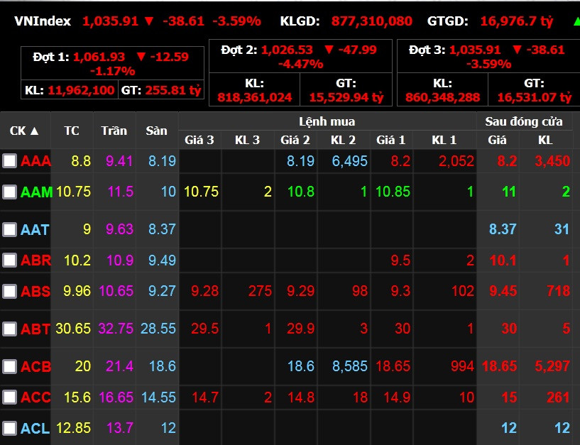 Đóng cửa phiên, VN-Index giảm mạnh 38,61 điểm (3,59%) xuống còn 1.035,91 điểm. Khối lượng giao dịch trên sàn HoSE đạt hơn 876 triệu cổ phiếu, tương đương giá trị giao dịch là 16,95 nghìn tỷ đồng. Chỉ có 52 mã tăng chứng khoán niêm yết trê sàn HOSE tăng giá trong phiên này, trong đó có 6 mã tăng trần.