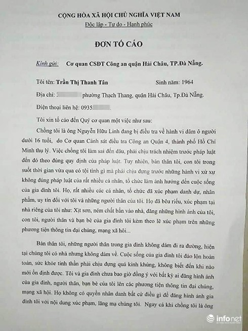 Sau khi Infonet đưa tin “Vợ bị can Nguyễn Hữu Linh gửi tâm thư đau đớn về vụ án của chồng”, trong sáng 27/4, Công an quận Hải Châu (Đà Nẵng) cho biết thêm vừa tiếp nhận đơn của vợ bị can Nguyễn Hữu Linh là bà Trần Thị Thanh Tân (sinh năm 1964, ngụ tại địa chỉ số 30 Lê Lợi, phường Thạch Thang, quận Hải Châu) tố cáo bị nhiều cá nhân, tổ chức xúc phạm danh dự, nhân phẩm, uy tín của bà và những người thân.