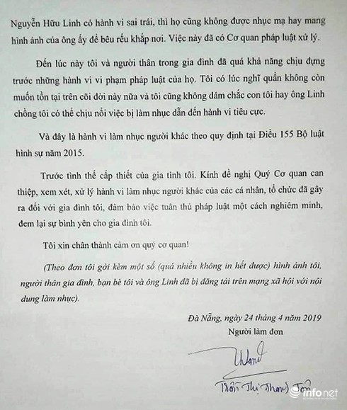 Lá đơn tố cáo này đề ngày 24/4/2019 với cùng chữ ký của bà Trần Thị Thanh Tân như trong bức thư đề ngày 26/4 chuyển đến Công an Đà Nẵng đề gửi “Các bạn quan tâm đến vụ án ông Nguyễn Hữu Linh”. Trong đó có câu: “Các bạn không nên có những hành vi gây tổn thương cho bản thân tôi và các con tôi, sự chịu đựng của chúng tôi đã vượt quá giới hạn của bản thân mình”.