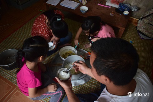 Từ ngày vợ bỏ đi, anh Bốn cũng chuyển về gần nhà làm thợ mộc để tiện chăm sóc các con. Với đồng lương ít ỏi (200.000 đồng/1 ngày), anh là nguồn thu nhập chính của cả gia đình. Song, nhiều hôm cơn đau dạ dày kéo đến anh Bốn chỉ biết nằm ở nhà. Không làm được việc gì, thu nhập hằng ngày của anh cũng chẳng có. Các con đành ăn cơm trắng chan nước canh sấu cùng bố. Nhìn các con ăn cơm mà nước mắt anh dàn dụa.