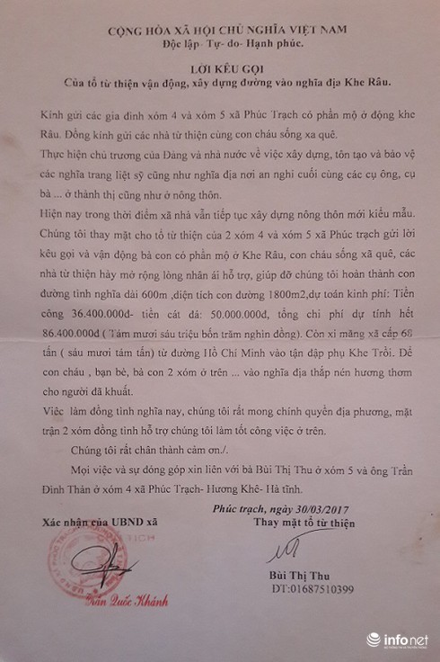 “Lời kêu gọi” được ông bà gửi đi khắp nơi để xin tiền về làm đường cho nhân dân xóm 4 và xóm 5 xã Phúc Trạch trong những năm qua. |