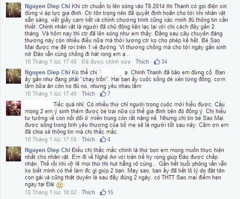 Trước đó, (ngày 10/1/2015), trên facebook cá nhân của mình, BTV Diệp Chi, cho biết: Khi chương trình chuẩn bị lên sóng vào tháng 8/2014 thì Thanh có gọi điện xin dừng vì áp lực gia đình. Chương trình tôn trọng nên đã quyết định hoãn cho tới khi nhân vật sẵn sàng, viết giấy cam kết và chính chương trình cũng xác minh đủ thông tin cần thiết. Chính nhân vật là người đã chủ động liên lạc lại với chị cách đây gần 2 tháng. Và hôm nay thì chương trình đã lên sóng….