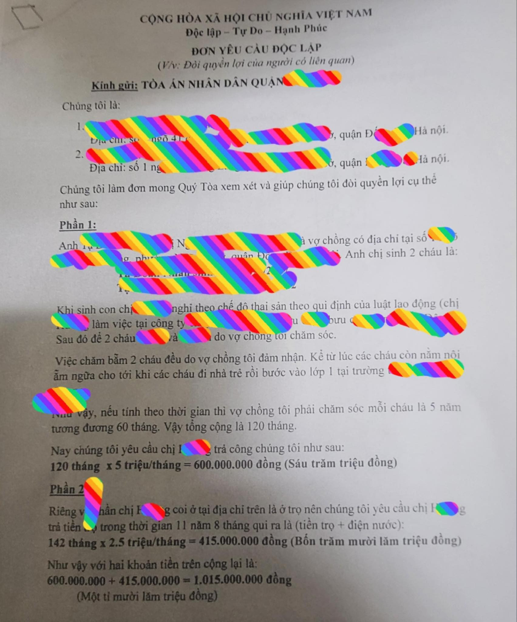 Trong đơn, bố mẹ chồng chị viết: “Việc chăm bẵm 2 cháu đều do vợ chồng tôi đảm nhận. Kể từ lúc các cháu còn nằm nôi ẵm ngửa cho tới khi đi nhà trẻ, rồi bước vào lớp 1.