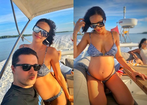 Phương Mai diện bikini gợi cảm chụp hình cùng chồng Tây ở những tháng cuối của thai kỳ. |