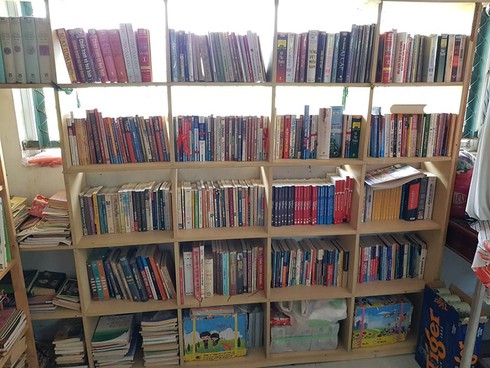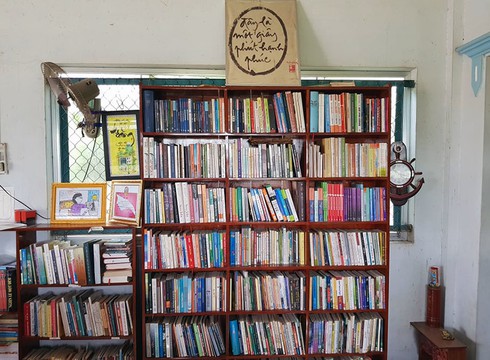 Trong căn nhà nhỏ lọt thỏm bên con đường, vợ chồng thầy Thế dành phần lớn không gian cho các kệ sách. Đây là những quyển sách mà thầy mua hoặc xin được để nuôi dưỡng tâm hồn cho trò.