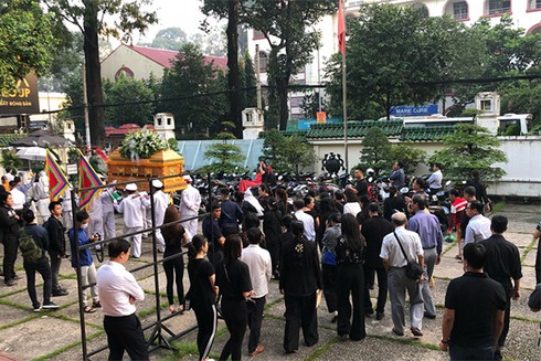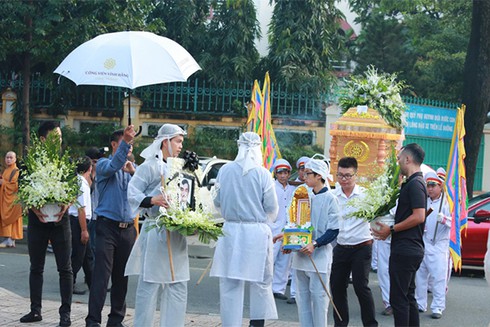 | Đoàn người đã di chuyển ra bên ngoài nhà tang lễ và chuẩn bị xuống nghĩa trang ở quận 9 nơi NSND Thế Anh yên nghỉ. |