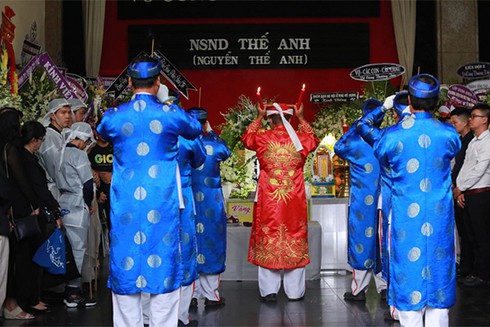 Sáng 3/10, gia đình và đồng nghiệp tiễn biệt NSND Thế Anh về nơi an nghỉ cuối cùng. Vợ của ông vì quá đau buồn nên không thể đứng vững, phải có người dìu trong lúc di quan.
