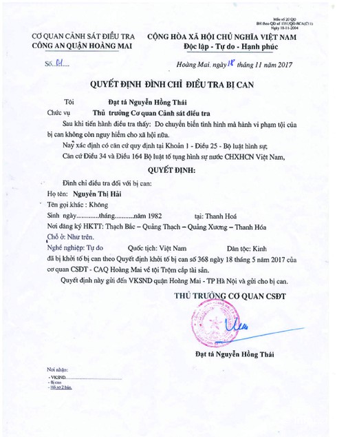 Theo nguồn tin riêng của PV Báo điện tử Infonet vừa mới nhận được, cơ quan CSĐT Công an quận Hoàng Mai (Hà Nội) đã ra quyết định đình chỉ vụ án, đình chỉ điều tra bị can đối với chị Nguyễn Thị Hải (35 tuổi, ở Quảng Xương, Thanh Hóa) về hành vi trộm cắp tài sản của chồng tại quận Hoàng Mai vào tháng 4/2017