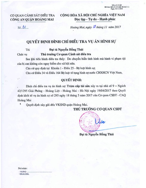 Quyết định đình chỉ điều tra vụ án. |