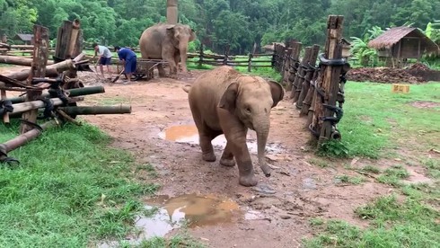 Người quản lý trang trại Sathian Jaikham cho biết, thời gian qua khu vực này có nhiều trận mưa lớn khiến đường trơn, dễ bị ngã. Chú voi con sau cú ngã nên có vẻ thất thế trước 2 chú chó với tinh thần... đoàn kết bất chợt.