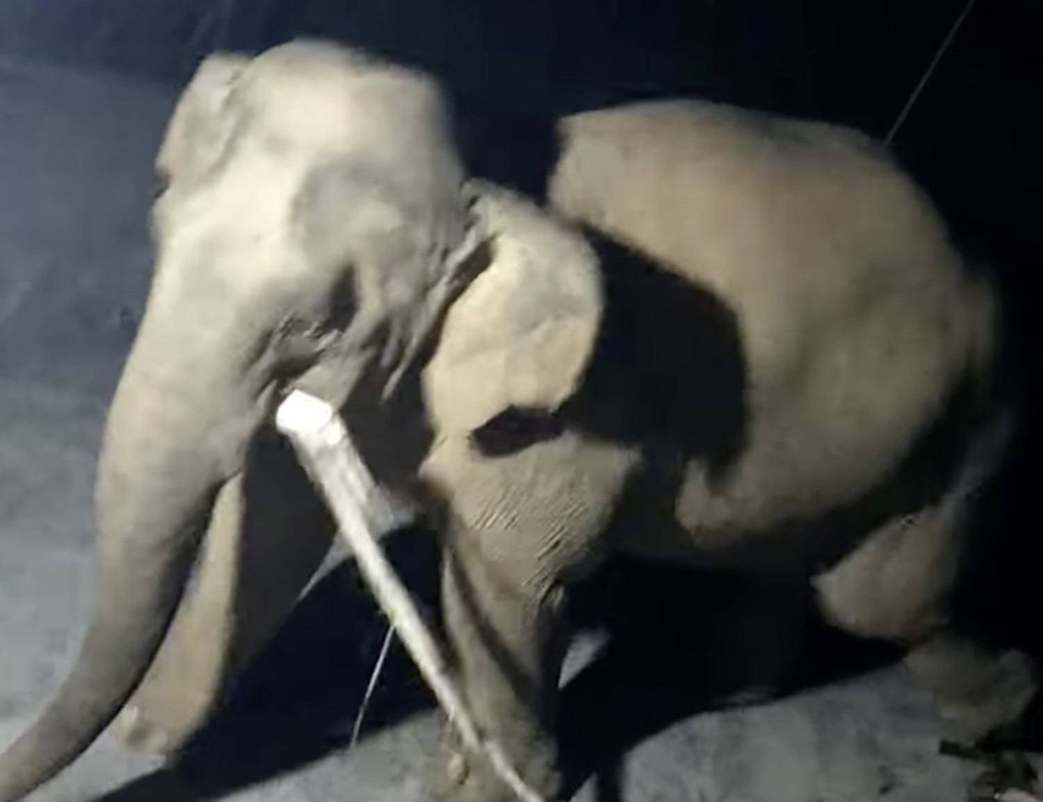 Quá trình lục lọi thức ăn, con voi này đã xô đổ những tấm gỗ làm nhà của người dân. Sau khi tìm thấy cây mía, chuối, con voi này mới rời đi.