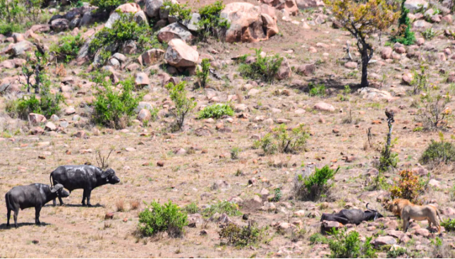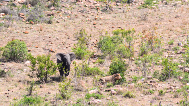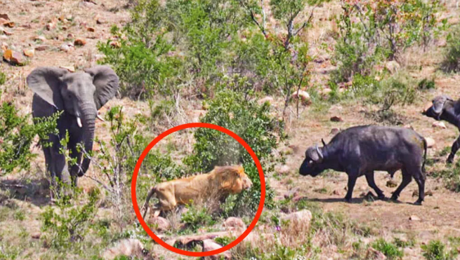 Con sư tử đực trông có vẻ khổ sở, nhỏ bé trước với một bên là voi trưởng thành và một bên là trâu rừng. Nó đành xoay sở để lẩn vào những bụi cây bao quanh đó.