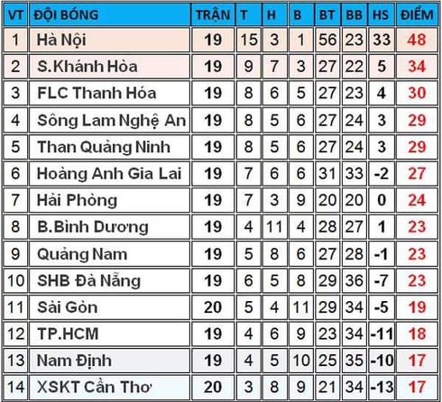 Bảng xếp hạng trước vòng 20: