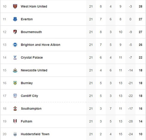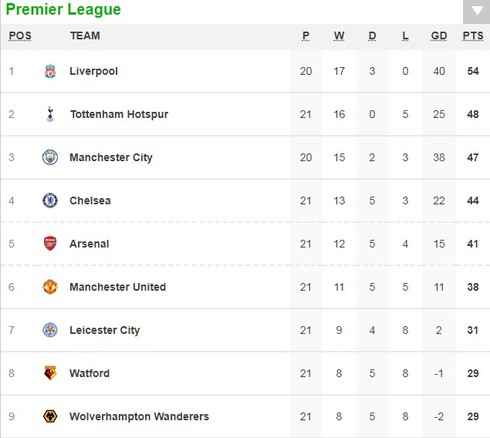 Bảng xếp hạng tạm thời vòng 21 Premier League: