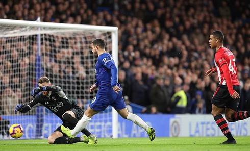 Bóng thường được đưa đến chân của tiền vệ Eden Hazard để mong có được sự đột phá, và ngôi sao người Bỉ suýt chút nữa đã có thể lập công trong tình huống đối mặt với thủ thành Angus Gun nhưng cú dứt điểm của Hazard khiến bóng đập trúng mặt Angus Gun, cứu thua cho Southampton.