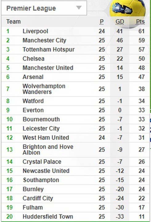 Bảng xếp hạng tạm thời Premier League. |