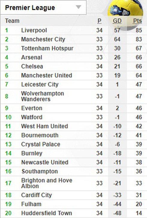 | Lịch thi đấu vòng 35 Premier League: Thứ Bảy, 20/04 18:30 Manchester City vs Tottenham Hotspur 21:00 AFC Bournemouth vs Fulham 21:00 Huddersfield Town vs Watford 21:00 West Ham United vs Leicester City 21:00 Wolverhampton Wanderers vs Brighton & Hove Albion 23:30 Newcastle United vs Southampton Chủ nhật, 21/04 19:30 Everton vs Manchester United 22:00 Arsenal vs Crystal Palace 22:00 Cardiff City vs Liverpool Thứ Ba, 23/4 02:00 Chelsea vs Burnley |