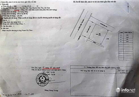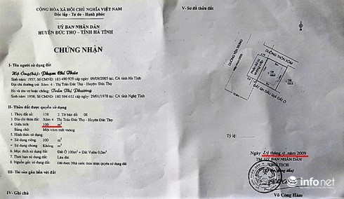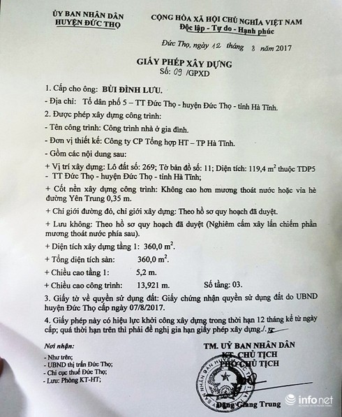 Ngay sau khi nộp tiền, cũng trong ngày 31/7/2017, UBND huyện Đức Thọ đã có Quyết định số 4567, về việc công nhận QSDĐ cho ông Bùi Đình Lưu. Đến ngày 7/8/2017, ông Lưu mới được cấp Chứng nhận QSDĐ, và ngày 12/8/2017 thì được cấp Giấy phép xây dựng.