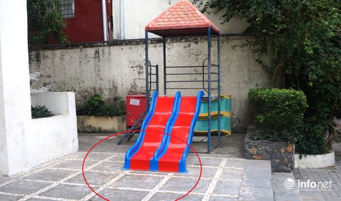 Khu vực cầu trượt trước sảnh chung cư Lotus, nơi cháu bé bị vật cứng rơi trúng đầu tử vong. |