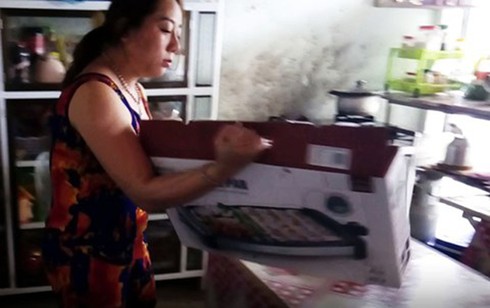 Mẹ kế bé T. (Trần Thị Kiều Tiên) lấy chiếc lò nướng còn nguyên trong hộp giải thích là vật gây ra 3 vết phỏng trên tay và mặt bé T. (Ảnh: K.Nam) |