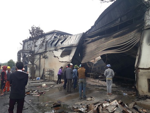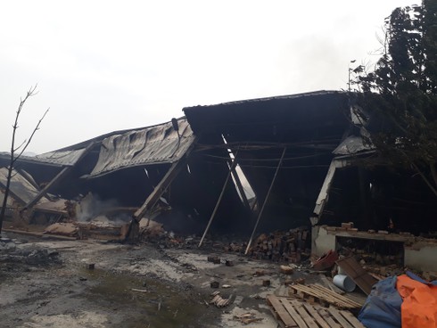 Tại hiện trường toàn bộ nhà xưởng rộng 1.200m2 bị đỗ sập hoàn toàn, nhiều đồ dùng trang thiết bị bên trong bị thiêu rụi, ngọn lửa vẫn đang còn bùng cháy tại một khu vực nhỏ của nhà xưởng.