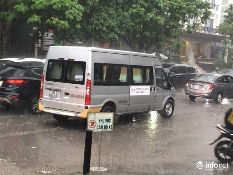 Chiếc xe 16 chỗ do ông Doãn Quý Phiến cầm lái di chuyển trong cơn mưa rất lớn trút xuống bất ngờ chiều 30/8. Chiếc xe mang BKS29B-069.56, được kéo rèm và có đặc điểm nhận dạng là được dán decal màu vàng hai bên đuôi xe. |