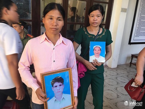 Người nhà mang di ảnh nạn nhân đến Tòa tại phiên xử sơ thẩm lần 1. |