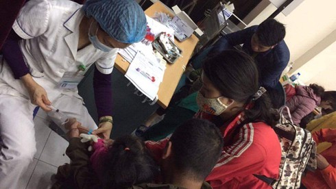 Các bác sĩ Bệnh viện Bệnh Nhiệt đới Trung ương đang lấy mẫu máu của các cháu để xét nghiệm |