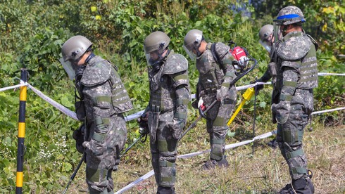 Binh lính Hàn Quốc rà phá bom mìn ở vùng biên giới giáp Triều Tiên hồi đầu tháng 10. |