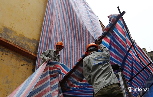 Công nhân đơn vị thi công đang tiến hành gia cố hệ thống đảm bảo an toàn lao động. |