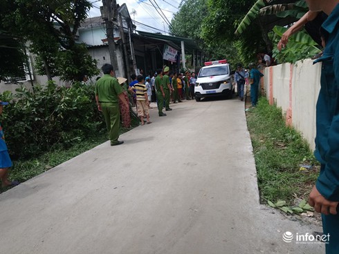 Thi thể nạn nhân được đưa xuống xe, trước nhà văn hóa thôn. |
