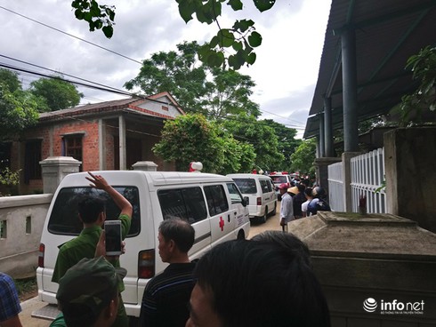 Đoàn xe chở thi thể các nạn nhân lần lượt vào nhà văn hóa thôn Lương Điền. |