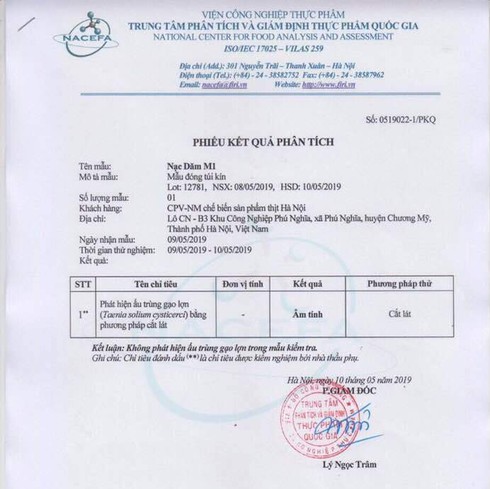 Chiều 10/5, nhà cung cấp đã cung cấp cho PV phiếu trả kết quả phân tích mẫu thịt do khách hàng trả lại. Theo đó, chỉ tiêu kiểm tra ấu trùng gạo lợn cho kết quả âm tính.
