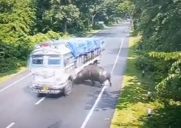 Video chia sẻ trên mạng xã hội cho thấy con tê giác trưởng thành đi ra phía đường nhựa từ cánh rừng. Nó dường như cố gắng băng qua đường nhưng không may lao thẳng vào một chiếc xe tải. Người tài xế cố gắng điều khiển xe tránh xa tê giác nhưng vẫn không thoát khỏi vụ tai nạn.