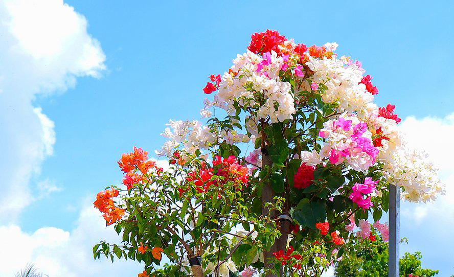 Những chậu hoa giấy cao quá nóc nhà, cho hoa rực rỡ cả một vùng trời do anh Lê Chánh Tín, chủ vườn hoa giấy Trường Tuy (TP Sa Đéc, Đồng Tháp) làm chủ đang thu hút rất nhiều du khách.