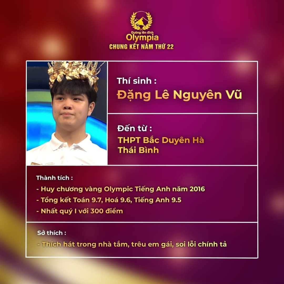 Chàng trai Đặng Lê Nguyên Vũ đã chinh phục thành công đỉnh Olympia năm thứ 22 đã khiến cho hàng vạn người dân quê hương Thái Bình như vỡ òa trong niềm vui hạnh phúc và tự hào