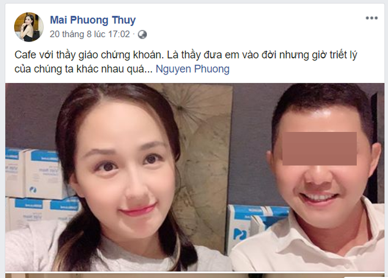 Mai Phương Thúy đăng ảnh kèm dòng status: "Cafe với thầy giáo chứng khoán. Là thầy đưa em vào đời nhưng giờ triết lý của chúng ta khác nhau quá..." |