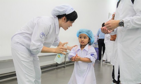 Trước khi vào tham quan, các bạn nhỏ được các cô chú nhân viên tại nhà máy hướng dẫn về cách di chuyển trong nhà máy, mặc trang phục bảo hộ và rửa tay đúng theo quy định của nhà máy. |