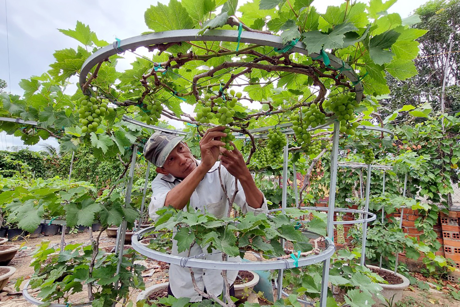 Trong khu vườn rộng ở xã Phước Thuận, huyện Ninh Phước, ông Đỗ Văn Thu, 56 tuổi, thành viên Hợp tác xã Nho cảnh A8 Phước Thuận, tất bật làm việc vào ngày cuối năm. Giữa vườn, ông cẩn thận dùng các đoạn sắt bện nhánh, lá gọn gàng vào khung đã định sẵn để tạo hình. Một số chùm nho có quả có dấu hiệu bị hỏng cũng được ông cắt tỉa rồi bao lưới lại.