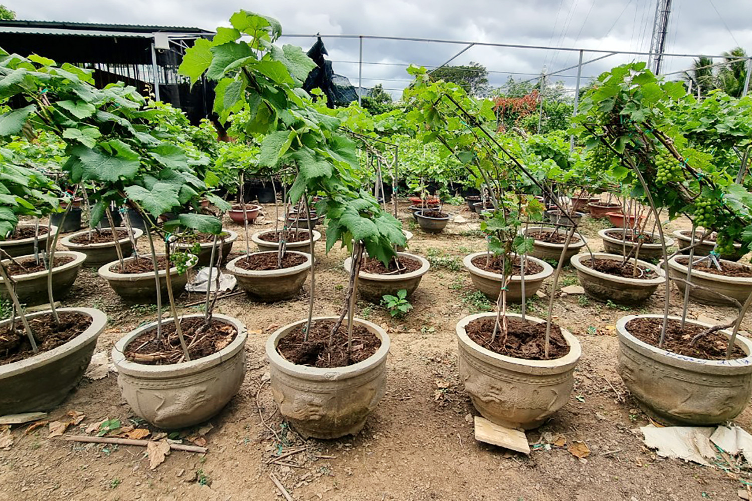 Cách đó không xa, nông dân Lê Văn Nhị đang kiểm đếm, phân loại lại trên 1.000 chậu nho bonsai đã chăm nhiều tháng qua. Những chậu nho cảnh của gia đình được cắt ghép kỳ công, mỗi cây cao 50-150m, chùm quả xòe rộng 60-90cm. Cây lá xanh mướt, chùm quả ngả màu chín đỏ, mọng nước.