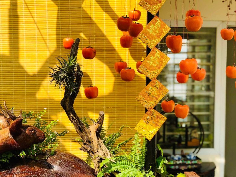 Chị giải thích: "Vườn sân thượng trước có 2 bánh xe bò và một quầy bar, do mình làm công việc dạy nấu ăn nên muốn tạo một điểm nhấn về nghề nghiệp, đồng thời tạo nhận diện thương hiệu. Thế nên mình mới thiết kế bánh xe bò làm backgroud, khi nắng lên, bánh xe sẽ phản chiếu lên rèm rất đẹp.