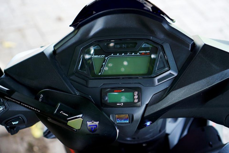 Phần bợ đồng hồ nhựa nhám được mod lại để phù hợp với đồng hồ Sonic 150 - ưu điểm của mẫu này là có dây điện tương tự với Winner nên chỉ cần gắn vào mà không phải chế cháo lại bất kì sợi dây điện nào. Đồng hồ Koso mini3 là được chế kèm theo để bổ sung thêm những chức năng mà đồng hồ Sonic không có như báo giờ, nhiệt độ và Volt. |