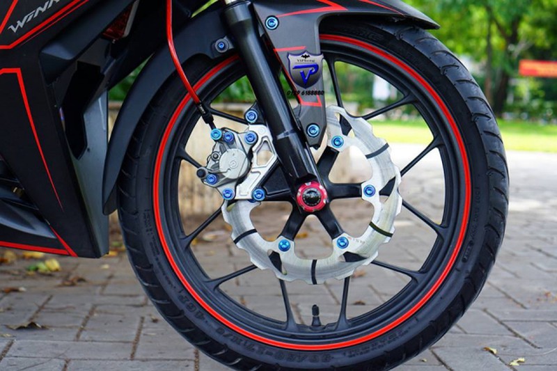 Nhìn xuống dàn chân trước ta sẽ thấy được hình ảnh của dây dầu Swit có thể xoay 360 độ đầu dây mà không sợ gãy dễ dàng ôm vào thế bắt của heo dầu hơn không làm công hay uốn dây - Cố định vào heo dầu Brembo logo nhỏ 2 pis đối xứng được tháo từ một số dòng xe của Ducati đời cũ làm pat lại để phù hợp hơn cho vỏ phuộc Winner. |