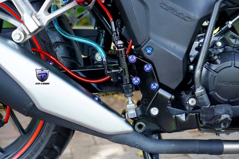 Còn đây là những nâng cấp ở dàn chân sau với rất nhiều chi tiết màu sắc như ốc Gr5 dùng để cố định pen đạp vào sườn xe - Phía sau sử dụng heo dầu Brembo logo lớn 2 pis đối xứng được làm pat xoay ngược xuống dưới. Mẫu heo này lần đầu tiên cũng xuất hiện trên các dòng xe PKL của nhà Ducati nhưng trên các phiên bản mới hơn so với logo nhỏ ở bánh trước. |