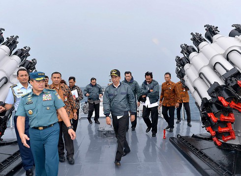 Tổng thống Joko “Jokowi” Widodođứng trên tàu hải quân IndonesiaKRI Imam Bonjol. |