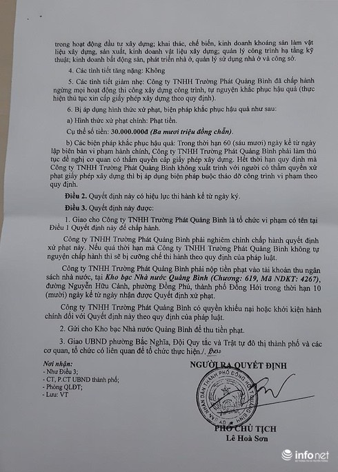 Quyết định cũng ghi rõ, trong 60 ngày kể từ ngày lập biên bản vi phạm hành chính, Công ty TNHH Trường Phát Quảng Bình phải làm thủ tục đề nghị cơ quan có thẩm quyền cấp giấy phép xây dựng. Hết thời hạn quy định mà Công ty TNHH Trường Phát Quảng Bình không xuất trình với người có thẩm quyền giấy phép xây dựng thì bị áp dụng biện pháp buộc tháo dỡ công trình vi phạm theo quy định.